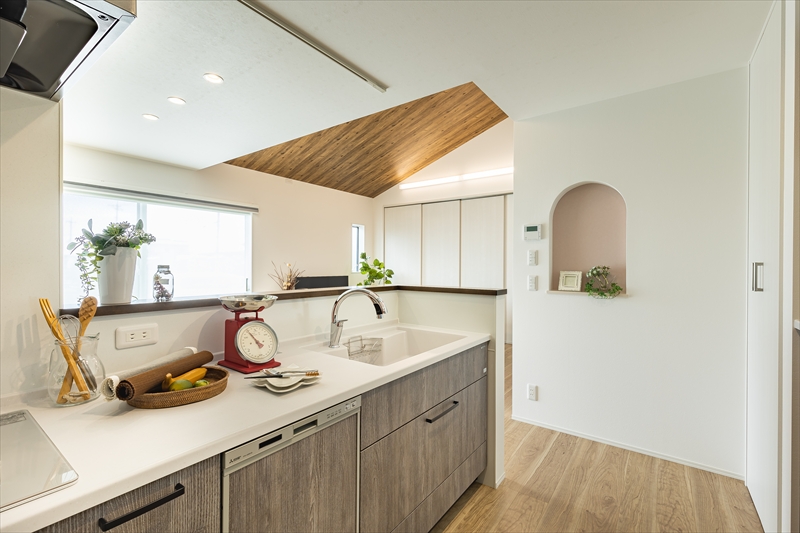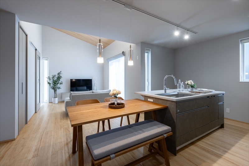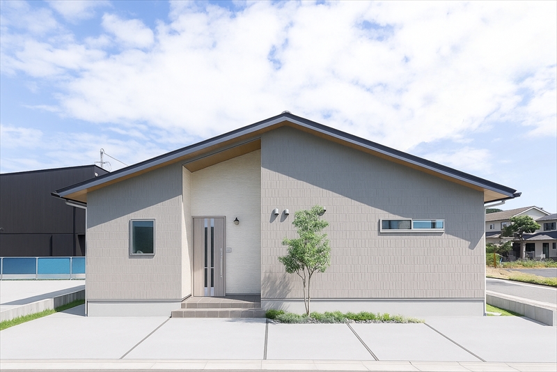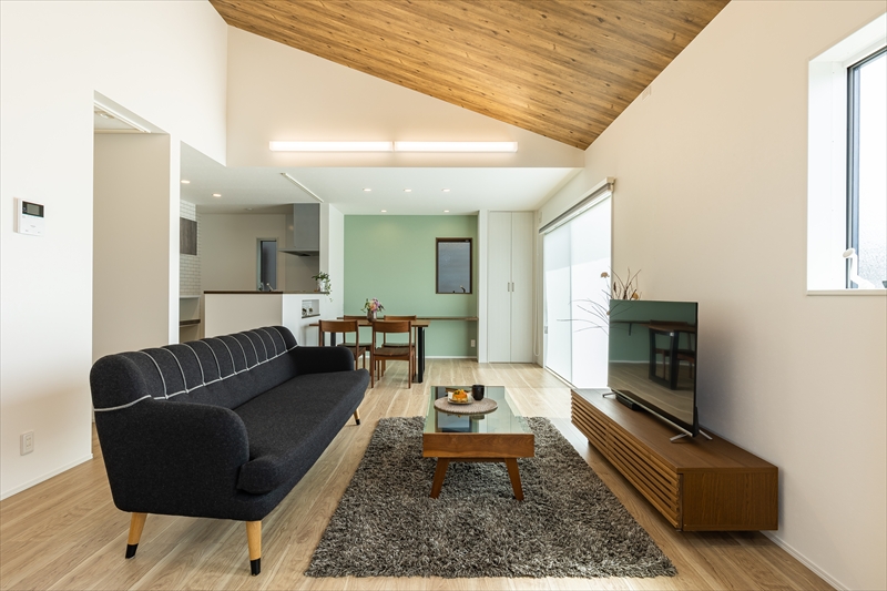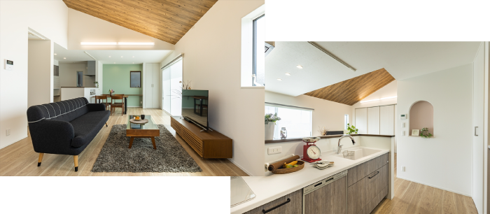 勾配天井が心地よい広々リビングを中心に、家事や生活動線にこだわった平屋の家。