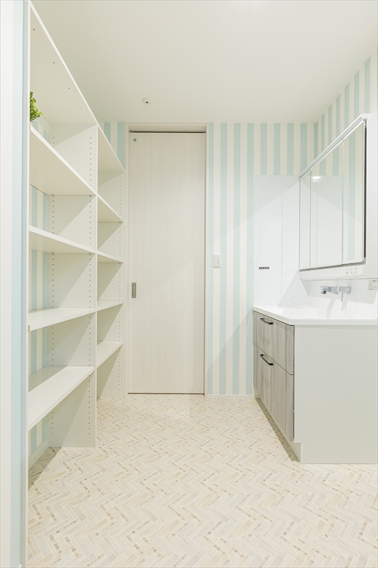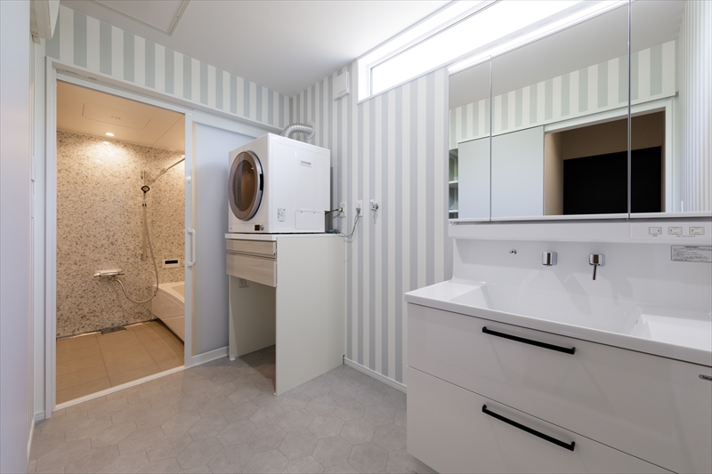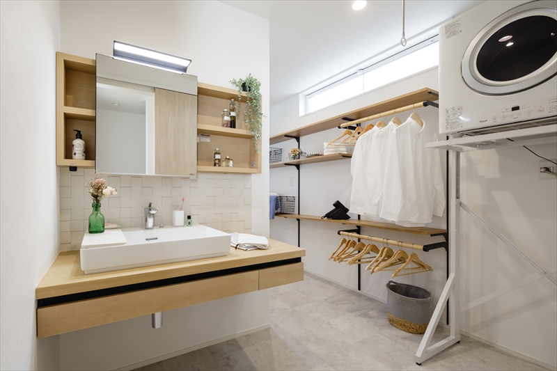 おしゃれで広い洗面脱衣室には、室内干しや衣類を掛けられ家事のしやすさをしっかり考えた設計。