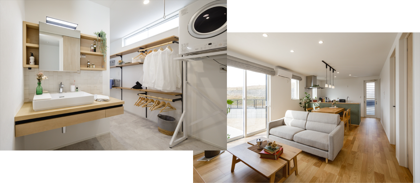玄関すぐの手洗いや各所の収納など、暮らしやすさを追求し、